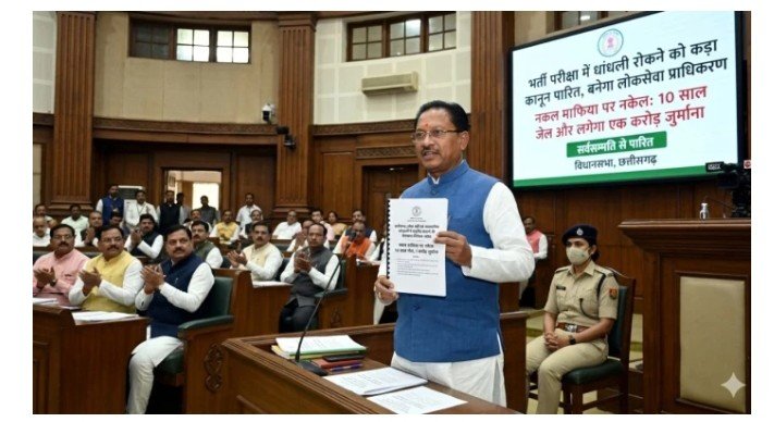 दिव्या न्यूज़ 18 :- रायपुर| भर्ती और व्यावसायिक परीक्षाओं में धांधली करना अब भारी पड़ेगा| विधानसभा में शुक्रवार को पेपर लीक और नकल माफिया पर नकेल कसने के लिए छत्तीसगढ़( लोक भारती एवं व्यवसायिक परीक्षाओं में अनुचित साधनों की रोकथाम ) विधेयक 2026 को सर्वसम्मति से पारित किया गया| मुख्यमंत्री विष्णु देव सहाय द्वारा पेश विधेयक को सत्ता पक्ष व विपछ के सदस्यों ने सहमति दी | नया कानून के तहत लोक सेवा प्राधिकरण का गठन होगा | जो कि छत्तीसगढ़ लोक सेवा आयोग व्यापम सहित राज्य सरकार के विभाग व उनके अधीनस्थ कार्यालय व सार्वजनिक उपक्रमों की परीक्षाओं की मॉनिटरिंग करेगा| नए कानून के तहत यदि कोई संस्थान प्रबंधन या सेवा प्रदाता प्रश्न पत्र लीक धोखाधड़ी में लिप्त पाया जाता है | तो उसे पर एक करोड रुपए तक का जुर्माना| और 10 साल की सजा हो सकती है|