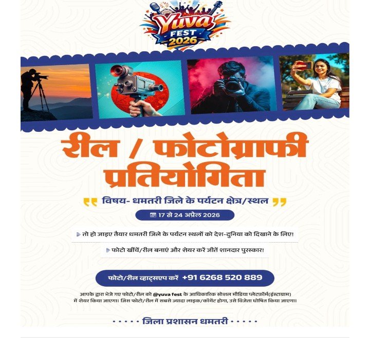 धमतरी जिले के पर्यटन क्षेत्र/स्थल विषय पर आधारित यह प्रतियोगिता 17 अप्रैल से 24 अप्रैल 2026 तक आयोजित हो रही है. इस पहल के माध्यम से प्रशासन न केवल पर्यटन को बढ़ावा देना चाहता है, बल्कि युवाओं को अपनी रचनात्मक प्रतिभा प्रदर्शित करने का एक सशक्त मंच भी उपलब्ध कराना चाहता है. प्रतियोगिता में जिले के युवा, फोटोग्राफी प्रेमी, सोशल मीडिया क्रिएटर्स, स्टूडेंट्स और आम लोग भाग ले सकते हैं.